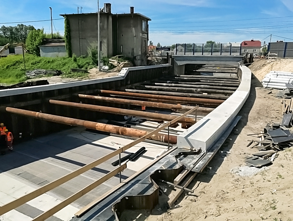 Zakres niniejszego zadania obejmował budowę obiektu inżynieryjnego, tj. konstrukcję dojazdów w postaci wanien szczelnych z grodzic stalowych wraz z żelbetową rozporą oraz płytami przejściowymi, systemem izolacji, odwodnieniem obiektu (bez jego wprowadzenia do odwodnienia drogowego) wraz z elementami wyposażenia i wykończenia konstrukcji.